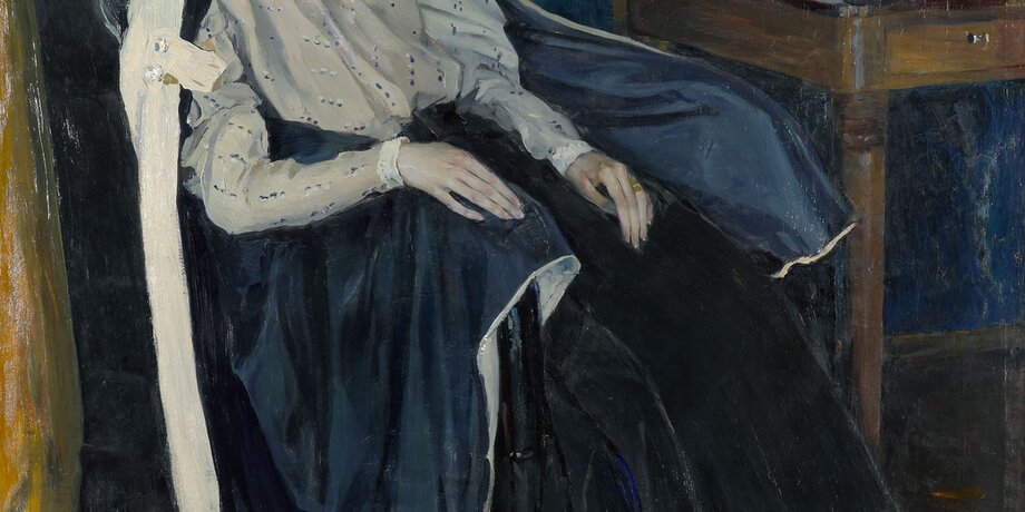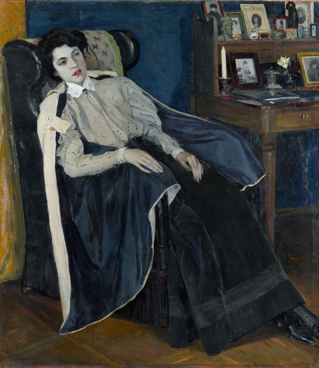 Ольга Михайловна была дочерью художника. В своих воспоминаниях об отце она говорила, что тот "всегда предпочитал моменты душевного одиночества, грусти или обреченности". Именно такой он изображает дочь на живописном портрете. Молодая девушка задумчиво сидит, откинувшись на спинку кресла. Но и на фотографии, где она запечатлена в парадном платье в пол-оборота, практически со спины, Ольга Михайловна выглядит такой же грустно-задумчивой. Можно сказать, отец очень чутко отнесся к ее натуре, работая над портретом дочери.