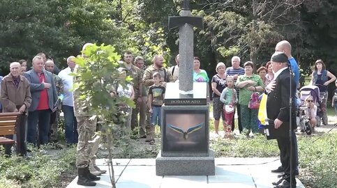 Памятник был открыт во вторник, 15 августа. Монумент в два с половиной метра изображает меч, вонзенный в плиту с нанесенной на нее картой России. У ангела, который держит меч, щит в виде герба Украины и украинский флаг.
