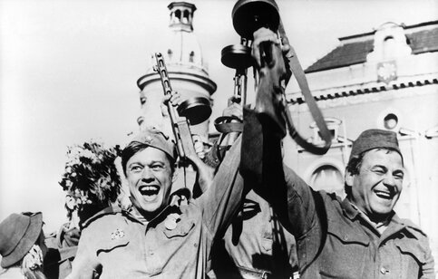А теперь, положа руку на сердце и не подглядывая в "Википедию" скажите: вы помните хоть одного рядового персонажа из "Освобождения"? Не то чтобы в лицо, но хотя бы по имени? К примеру, танкиста, погибшего в Рейхстаге за пару часов до Победы? А как звали девушку капитана Цветаева? Пусто, пусто, пусто, пусто. Все они выглядят как собирательные образы, взятые из популярной на исходе 1960-х лейтенантской прозы, их честные и светлые лица запоминаются, а имена, слова и поступки – нет. Ну вот разве что эпизод со спасением мирных жителей из затопленного берлинского метро, но он сам по себе насквозь метафоричен как эпизод с танком и виноградом в "Отце солдата".
