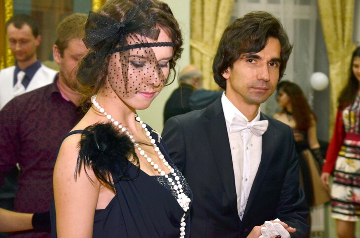 Участники вечера студии "Русские традиции" были одеты в недлинные платья и черные костюмы в стиле 20-х годов XX века. Наряды дам украшали нитки жемчуга, перья, вуалетки и блестящие элементы. Гламур и роскошь. Грация и красота. Аромат духов и магия танца.