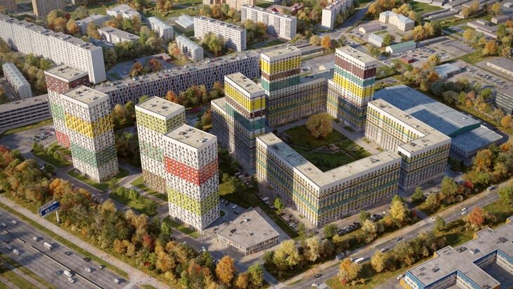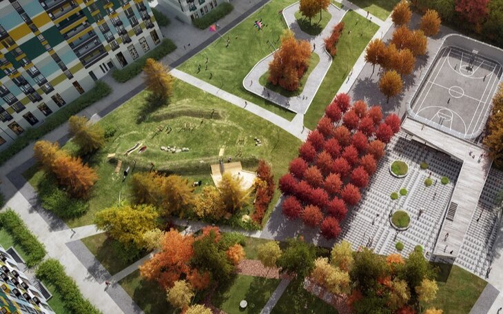 В облицовке многоэтажек использованы несколько цветов: белый, розовый, желтый, сиреневый и другие. Во дворах и между домами предусмотрены детские площадки, зоны отдыха с деревьями и кустарниками и прогулочные зоны. Припарковать машину можно будет на подземных и наземных стоянках.