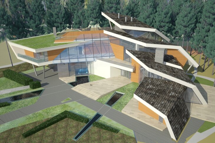 При проектировании дома в поселке Сосны, архитекторы решили создать искусственный рельеф и использовать "подземное" пространство. "Поскольку участок небольшой, а дом требовался немаленький, мы предложили заказчику часть помещений разместить под землей", – говорит Вера Бутко. Там расположены гараж, студия и бассейн с саунами. Как и в других проектах, сложная динамичная форма дома была продиктована функциональным зонированием помещений.