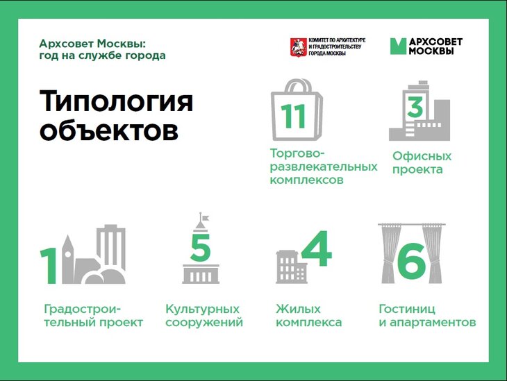 За год работы Архсовет провел 14 заседаний, на которых было рассмотрено 30 объектов. 19 из них были "в целом поддержаны" с рекомендациями по небольшой доработке, 8 - отклонены. Кроме того, по инициативе Архсовета по трем проектам заказчики организовали конкурсы: международный на разработку архитектурно-градостроительной концепции территории завода "Серп и Молот", национальные конкурсы на проектное решение торгового центра на "Полежаевской" и на разработку концепции архитектурно-художественного образа фасадов Третьяковской галереи.