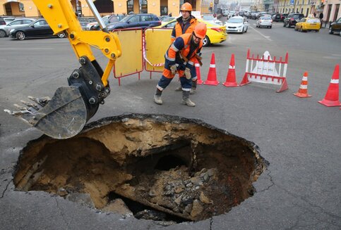 По одной из версий, покрытие могло испортиться из-за перепада температур. По другим данным, к проседанию грунта мог привести некачественный ремонт труб.