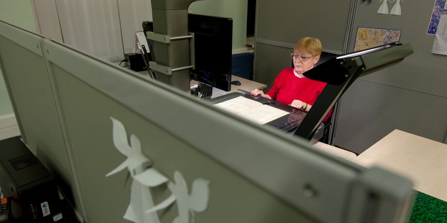 В комнатах копирования полумрак и тишина. За большими сканерами сидят женщины, они ритмично перелистывают листы старинных книг и делают их снимки.