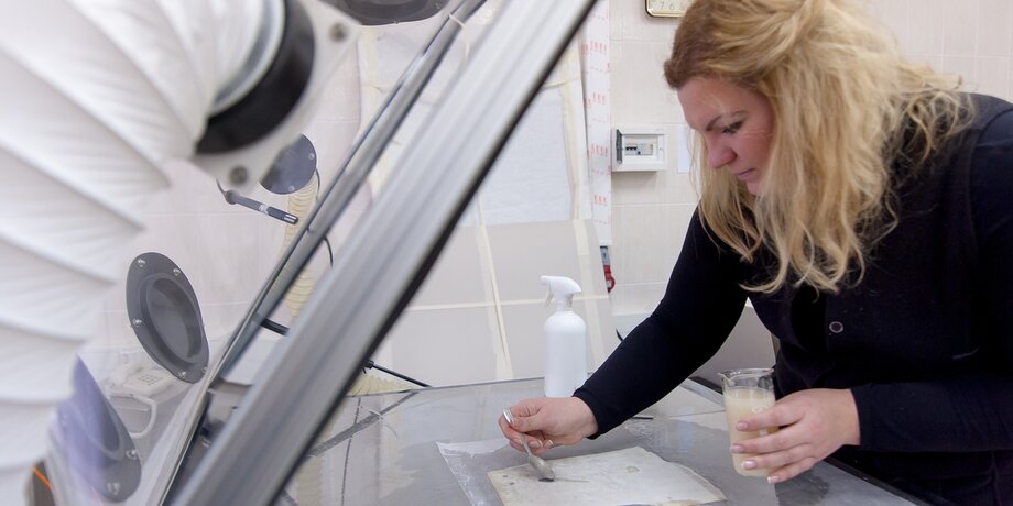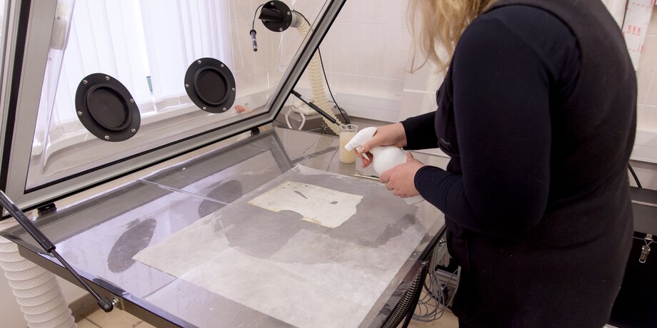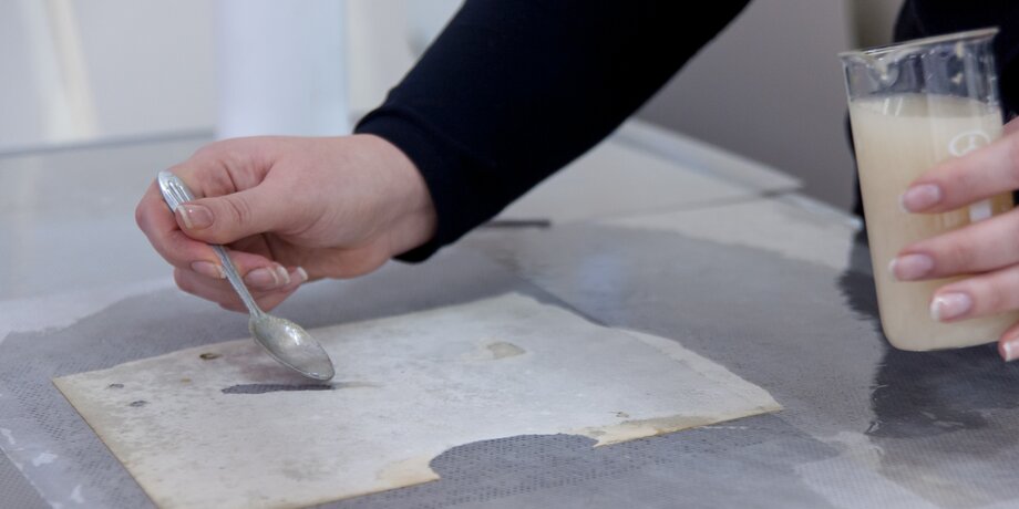 Специалисты лаборатории мне показывают, как происходит реставрация утрат методом доливки бумажной массы. Лист для реставрации кладут на вакуумный стол. В местах, где на документе есть разрывы, реставратор из обычной чайной ложечки наливает жидкую бумагу – густой раствор светло-бежевого цвета. Затем специалист включает оборудование, на столе создается область низкого давления, жидкая бумага потихоньку застывает и становится частью листа. Пройдет несколько дней, отреставрированный документ полностью просохнет, и неспециалист, посмотрев на него, даже не догадается, что когда-то он был порван.