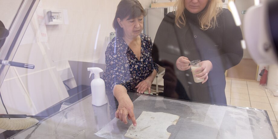 – Мы часто получаем документы в ужасном состоянии, до них даже дотронуться руками нельзя, листы крошатся на части, – рассказывает Татьяна Сиротинская, отвечающая за реставрацию документов в лаборатории. – Наша задача – укрепить его, для каждого экземпляра мы составляем индивидуальный план реставрации.