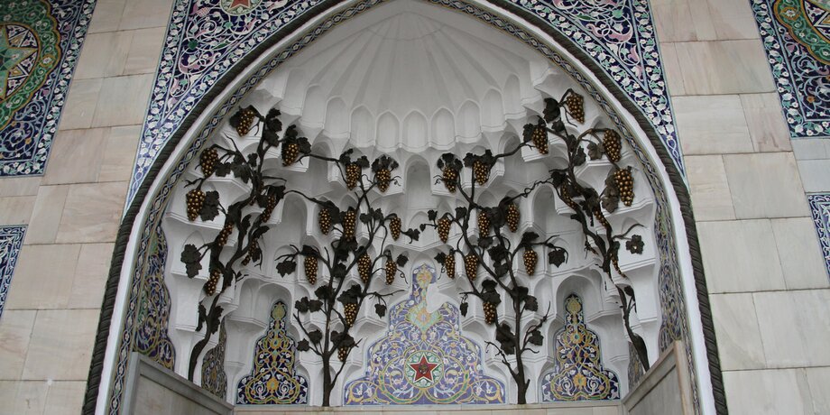 Прежний вид после реставрации вернули фасаду павильона "Вычислительная техника", главным украшением которого является арка над входом. Она оформлена золотыми гроздьями винограда и мозаичным орнаментом.
