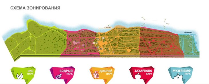 Наряду с объединением под единым брендом планируется разбить территорию на тематические зоны, каждая из которых будет иметь свое название, логотип и фирменный цвет. Всего на севере столицы появится 6 парковых зон: "ЭКО парк", парк "Музей ВМФ", парк "Добрый", парк "Бодрый", парк "Речной вокзал" и парк "Захарково".