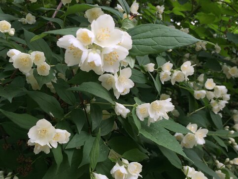 В "Аптекарском огороде" представлены формы и сорта чубушника обильноцветущего, мелколистного, тонколистного и седоватого. Многие путают этот кустарник с настоящим жасмином, но в наших широтах он может расти только в оранжереях.