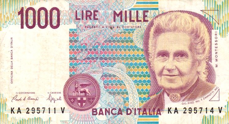 Мимо знаменитого педагоги не прошли и дизайнеры, поместившие ее портрет на купюру достоинством в тысячу лир.