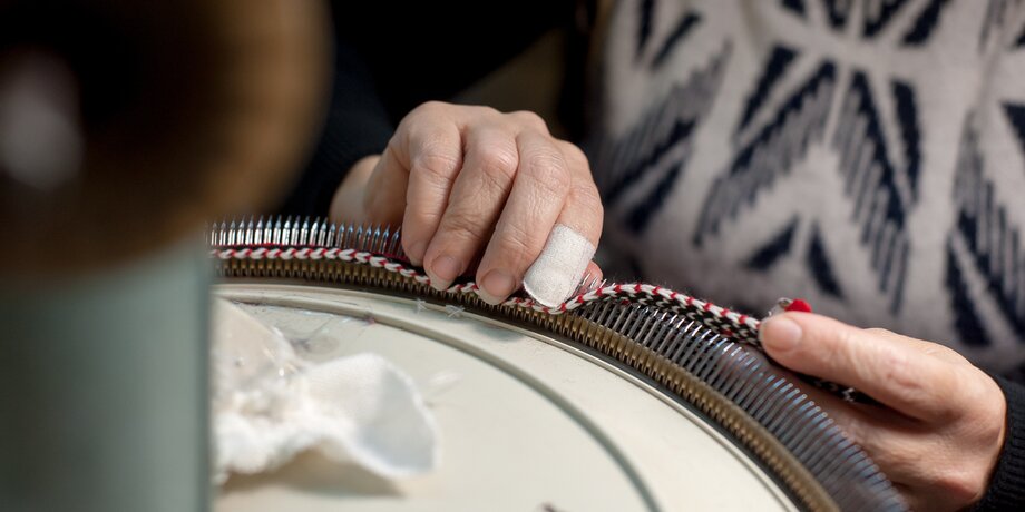 Всю пряжу, которую мы закупаем, мы перематываем. Это нужно для того, чтобы убрать с нее лишний ворс, а также обработать ее воском. Натуральная шерсть подвержена разрыву, а вязка в машине происходит на довольно большой скорости, так что если не обработать ее воском, она будет постоянно рваться. Поэтому перед тем, как передать вещь в руки покупателя, необходимо выстирать этот воск, а также вещества, которые оседают на пряже во время производства.