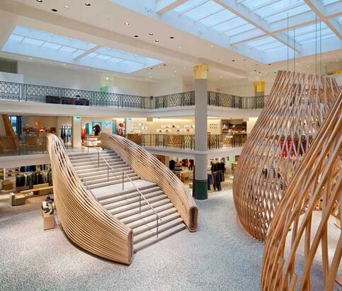 Самым интересным элементом дизайна в бутике стали массивные деревянные хижины, высота которых насчитывает более 9 метров. Также стоит отметить освещение бутика. Внутренне пространство здесь заполнено естественным светом, который проникает через три больших световых люка, установленных над атриумом.
