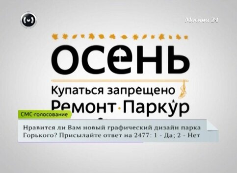 Канал "Москва 24" проводит голосование для москвичей: нравится ли вам новый графический образ парка культуры и отдыха имени Горького? Выразить свое мнение можно через SMS-сообщение на номер 2477 с цифрой 1, если вам нравится, с цифрой 2 – если вы считаете дизайн неудачным