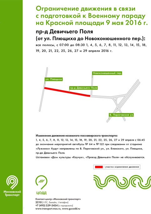 С 6:45 и до окончания мероприятия автобусы №№ 64 и 132 при следовании от стадиона "Лужники" направят по улицам Большая Пироговская, Еланского, Плющиха и проезду Девичьего Поля. Остановки "Дом культуры", "Каучук" и "Проезд Девичьего Поля" обслуживаться не будут.