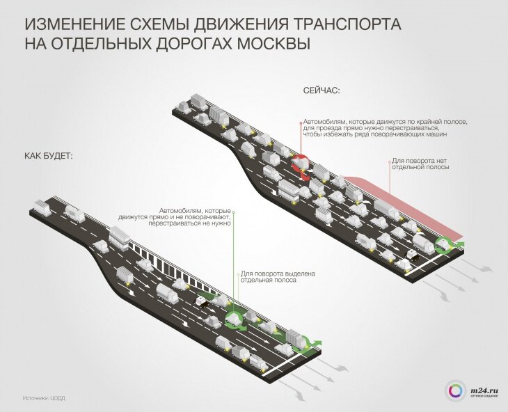 "Необходимость перестраиваться перед перекрестком была плоха тем, что тормозила поток и приводила к "притирочным" авариям. Теперь же в левоповоротный карман уходит только левая полоса из пяти, а остальные четыре спокойно и без перестроений едут прямо. Таким образом, нам удалось сократить количество перестроений, тем самым повысится и скорость, и безопасность", – пояснил советник руководителя ЦОДД Андрей Мухортиков.