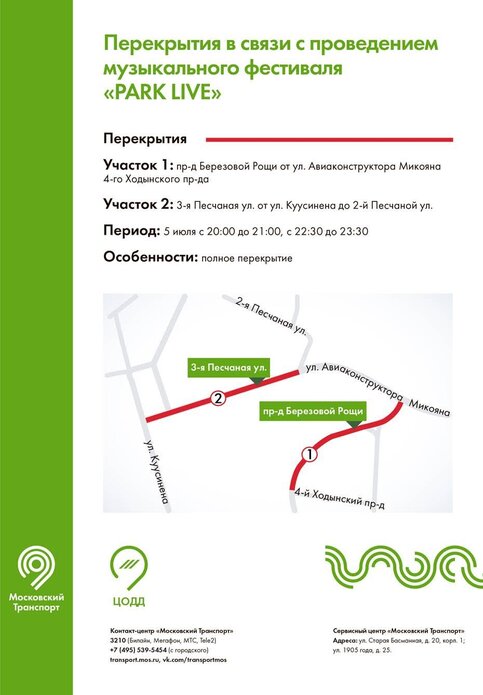 Участки проезда Березовой рощи от улицы Авиаконструктора Микояна до 4-го Ходынского проезда и 3-й Песчаной улицы от улицы Куусинена до 2-й Песчаной улицы закроют 5 июля в связи с проведением музыкального фестиваля Park Live, сообщает информационный центр транспортного комплекса Москвы.