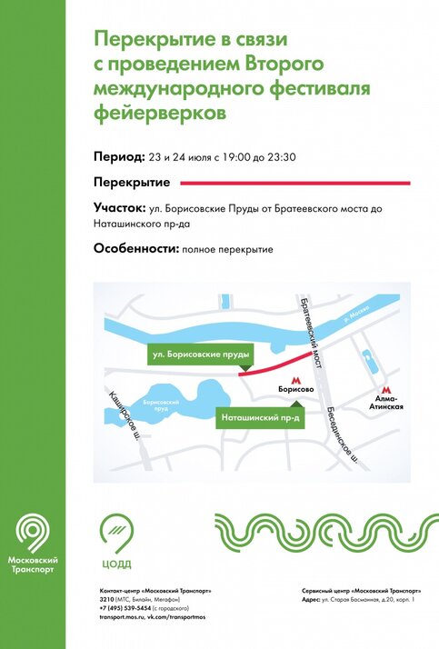Кроме того, с 17:30 до окончания фестиваля автобусы № 738, 742 и 764 пройдут в объезд улицы Борисовские Пруды на участке от Братеевского моста до Наташинского проезда.
