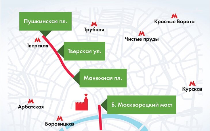 Ограничения будут действовать с 21:00 до 23:30 на Тверской улице от Пушкинской площади, на Манежной площади и Большом Москворецком мосту. Движение восстанавят постепенно, по мере прохождения колонн.