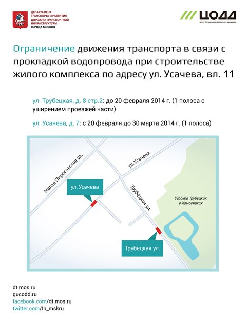 Движение транспорта на ряде улиц в центре Москвы ограничат в связи с прокладкой водопровода при строительстве жилого комплекса на улице Усачева, информирует пресс-служба столичного департамента транспорта и развития дорожно-транспортной инфраструктуры.