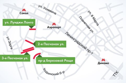 Движение будет закрыто на 3-й Песчаной улице от улицы Куусинена до 2-й Песчаной улицы. Также проехать не получится по проезду Березовой Рощи от Ходынского бульвара до 4-го Ходынского проезда.