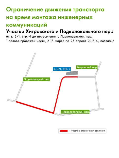 На время монтажа инженерных коммуникаций ограничено движение в Хитровском и Подколокольном переулках до пересечения с Подкопаевским переулком, сообщает Центр организации дорожного движения правительства.