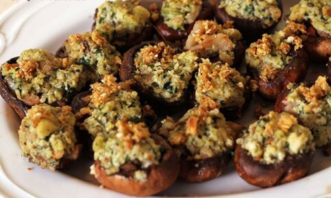 Затем необходимо смешать хлебные крошки, йогурт и обжаренные грибные ножки с грудинкой. Полученной начинкой наполняем шляпки грибов и запекаем на гриле или в духовке приблизительно 25 минут при температуре 180 градусов.