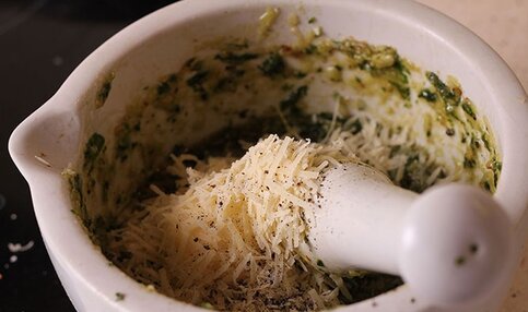 Конечно, гораздо проще и быстрее будет измельчить все ингредиенты в блендере. Но стоит один раз использовать для этого ступку, и вы сразу почувствуете разницу. Нож блендера разрубит все на мелкие частицы, а песто, приготовленное в ступке, будет фактурным, хотя и не однородным.