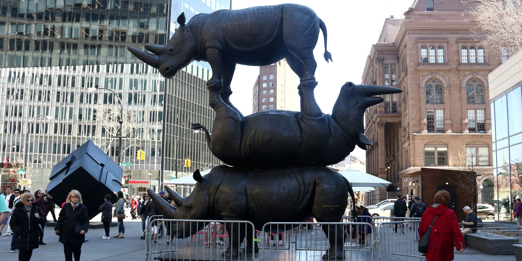 Памятник последним белым носорогам The Last Three работы австралийских художников Джилли и Марка Шэтнеров установлен на площади Astor Place в Нью-Йорке. Фото: ТАСС/Zuma/Nancy Kaszerman