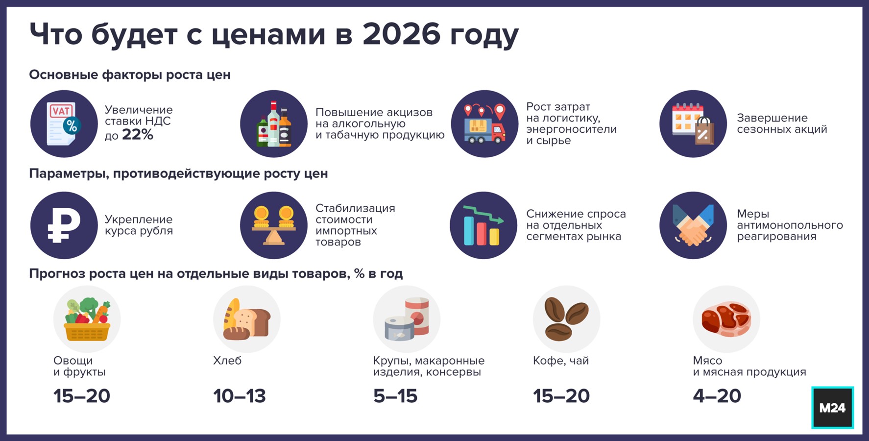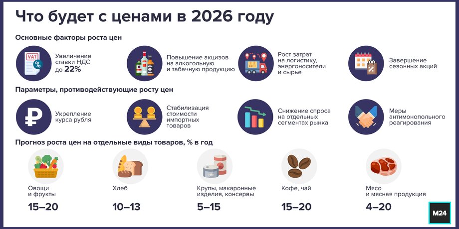 "Ожидаемый уровень роста цен, вероятно, будет примерно соответствовать показателям конца 2025 года. Возможно, чуть выше из-за изменений акцизов и НДС, но незначительно. В части товаров можно ожидать стабилизации стоимости импортной продукции, например бытовой техники", – добавил Колганов.