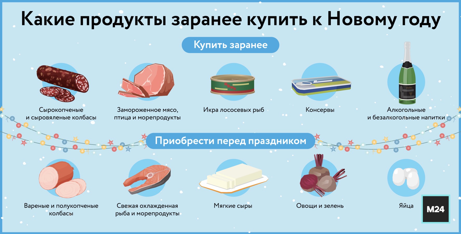 В свою очередь, диетолог-гастроэнтеролог, нутрициолог Александра Разаренова отметила, что традиционный рост цен перед Новым годом побуждает многих делать покупки заранее, но важно помнить, что сроки хранения у разных продуктов сильно отличаются. Чтобы сохранить качество и безопасность, некоторые товары можно покупать заблаговременно, а другие – не раньше чем за один-три дня до праздника, предупредила она в разговоре с Москвой 24.