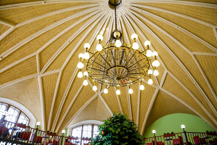 "Этот зал создал инженер Александр Кузнецов. Больше всего он любил две вещи. Во-первых, готику, как самый честный, не скрывающий своих конструкций стиль. В своих постройках Кузнецов тоже не прятал конструкции. Он доводил их до такой красоты, что они воспринимались как декорации А во-вторых, Кузнецов любил железобетон. Обе любви можно увидеть на потолке. Готические нервюры (ребра, выступающие на готических сводах), которые обычно делали из кирпича или камня, здесь сделаны из железобетона, – говорит Айрат, и в доказательство показывает фотографию со строительства.