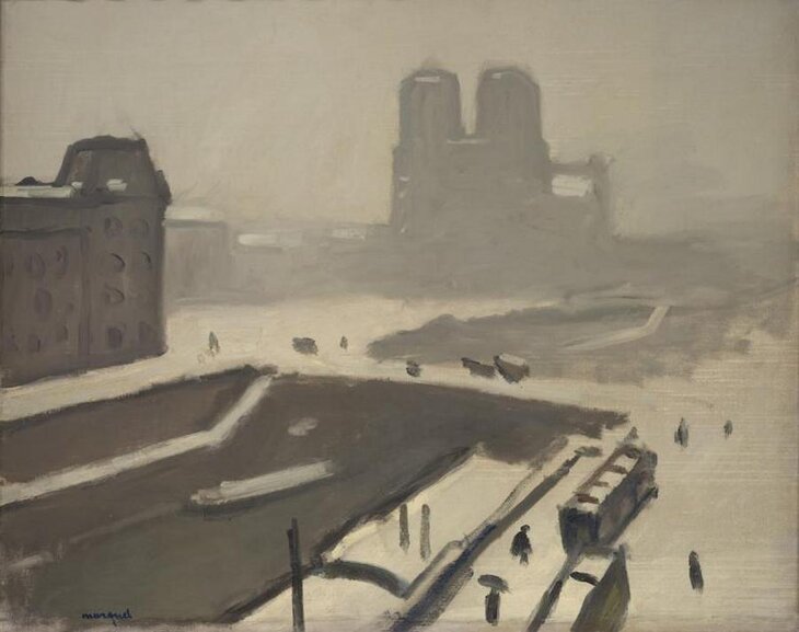 Как и многие современники, Марке изучал выразительные особенности монохромной живописи. Отличный тому пример – "Собор Парижской богоматери зимой". Этот вид Сены всегда изображен чуть сверху, потому что мастерская художника, откуда он глядел на Париж, находилась на третьем этаже.
