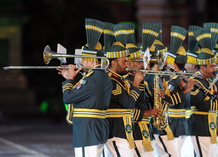 Оркестр Вооруженных сил Пакистана привлекает внимание не только репертуаром, в который входят официальные гимны, классическая музыка и фольклорные мелодии и песни, но и костюмом. Важный предмет пакистанской военной формы – плюмаж. Это – похожее на веер украшение на головном уборе.