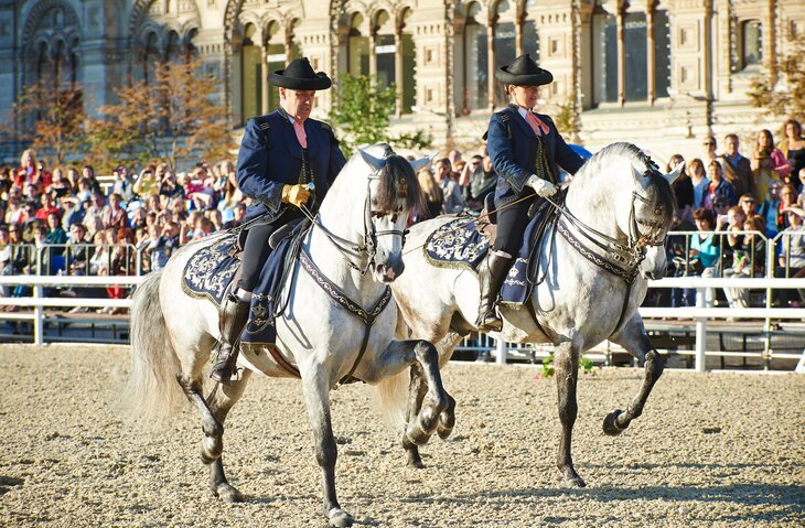 Всадники Королевской Андалузской школы искусства верховой езды из Испании выступают в национальных костюмах XVIII века. Они представляют уникальное шоу – конный балет, который берет начало за 500 лет до нашей эры.