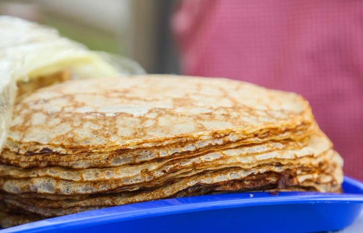 На Тверской стоит попробовать цветные слоеные чайные блины. Здесь же можно будет купить блин-ролл с бамбуковым углем, каймак-блин с балканским сливочным сыром, "брусникин блин" со сгущенкой и брусникой и "морошкин блин" с морошкой и сгущенкой.