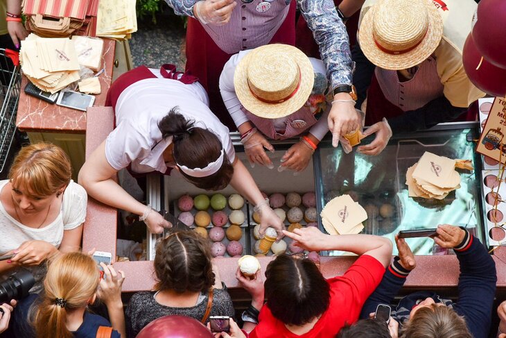 День мороженого по традиции отмечают в ГУМе 5 июля. Специально к этому празднику было приготовлено свыше 130 тысяч порций фирменного холодного лакомства.