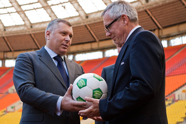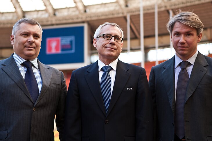 Слева направо: руководитель департамента по физической культуре и спорту г. Москвы Воробьев Алексей Олегович; руководитель департамента FIFA по организации Чемпионатов мира 2014, 2018 и 2022 годов Юрген Мюллер; генеральный директор Оргкомитета "Россия-2018" Сорокин Алексей Леонидович