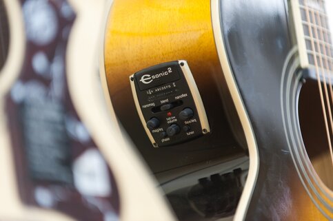 Кроме того, при выборе гитары стоит обратить внимание на то, что некоторые модели имеют встроенную электронику – она нужна для того, чтобы подключить инструмент к усилителю. У таких гитар под бриджем установлена небольшая металлическая планка, которую вы увидите в процессе замены струн. Эта планка называется пьезо-звукоснимателем и реагирует на вибрацию от струн. Далее звукосниматель передает сигнал на электронику и она, в свою очередь, переводит его на выход, который чаще всего расположен в нижней части обечайки.