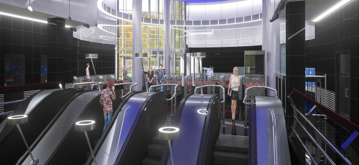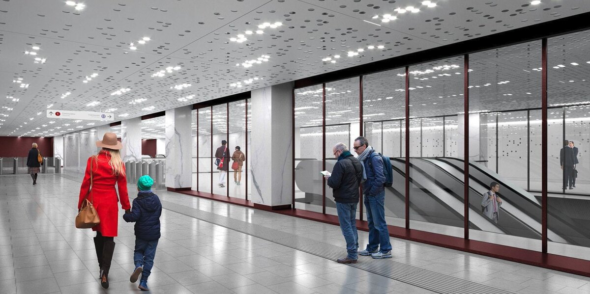 Вход в наземный вестибюль станции сделают полностью прозрачным, а фасад покроют перфорированными панелями, которые помогут создать иллюзию трехмерного пространства.