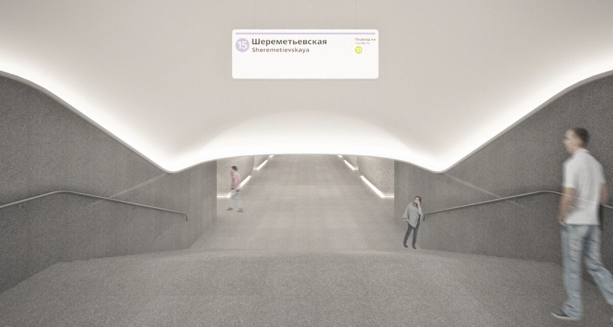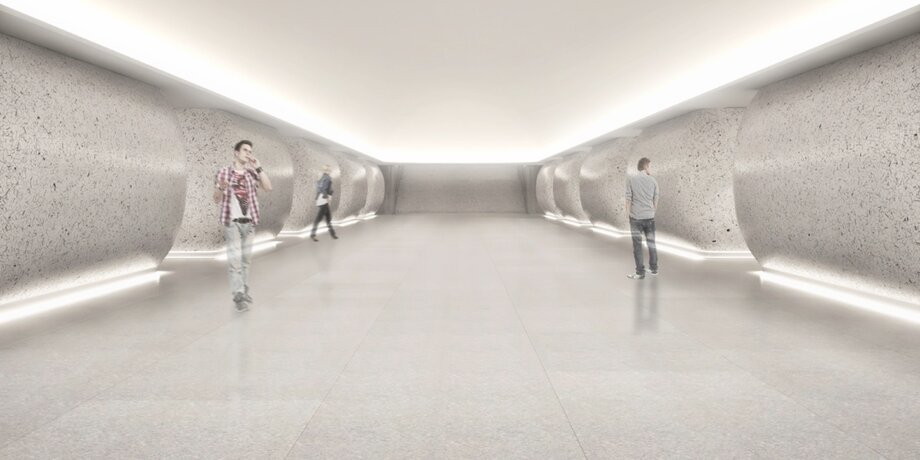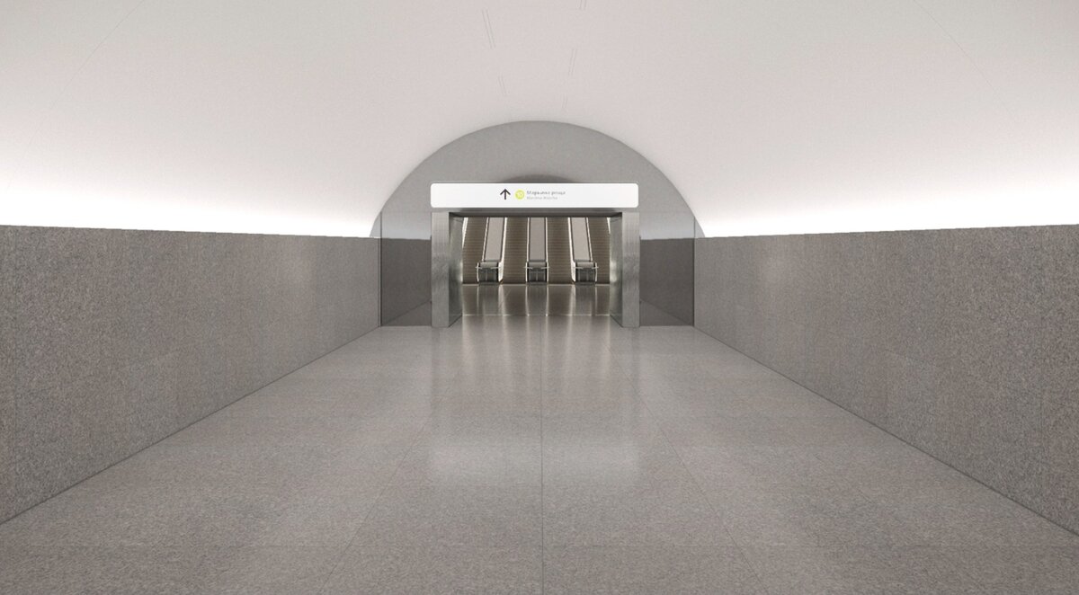 На полу будет лежать износостойкий светлый гранит, потолок станции сделают сводчатым – благодаря особенной подсветке он будет казаться бесконечным. Вестибюль также украсят сферические объемы – они задекорируют колонны.