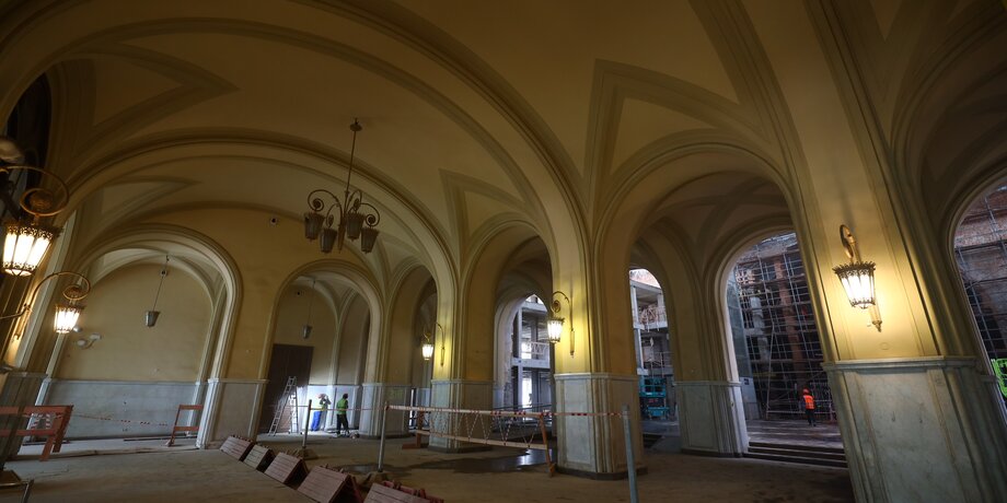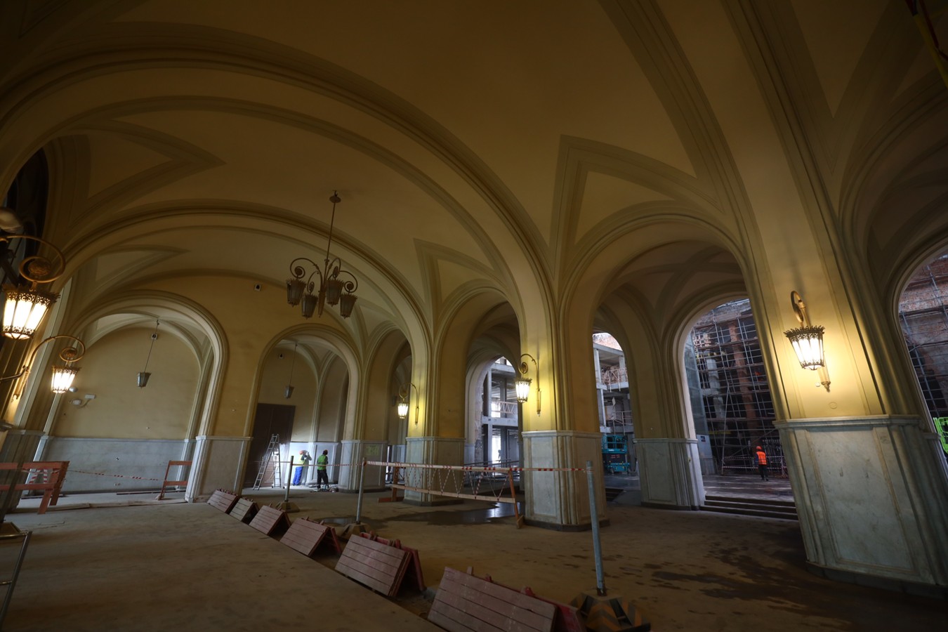 Во время демонтажа отделки со стороны кассового зала были выявлены фрагменты исторических архитектурных элементов – пилястр и карниза, расположенных на северном фасаде здания. Эти элементы помогли воссоздать первоначальные пропорции фасада.