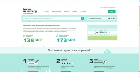 Ранее сообщалось, что почти за 2 года работы городские порталы "Наш город", "Дороги Москвы" и "Дома Москвы" посетили 3,5 млн человек. От жителей Москвы получено более 100 тысяч сообщений по 40 проблемным темам