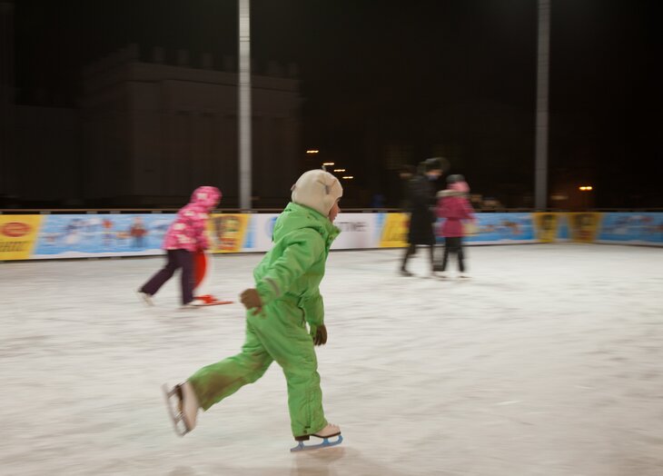 На нашем льду cуществуют правила поведения. Например, на катке запрещено играть в догонялки или колдунки. Нельзя выходить в конькобежных коньках, потому что можно разогнаться и сбить человека. Понятно, что человека в обуви мы тоже не пустим.