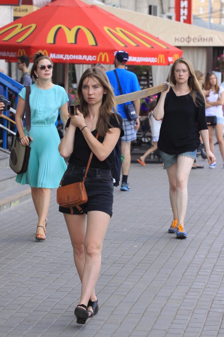 Труба, вернее, строительная балка, довольно тяжелая: она весит 13,5 килограммов и длиной в несколько раз превосходит рост самих участниц перфоманса. На сайте проекта Революционная осьхудожницы описали свой замысел возвышенно: "Мы изымаем обыденное действие – рабочие переносят строительный материал – из контекста строительства, лишаем его общеизвестной функциональности и освобождаем от классовой принадлежности. Наше действие – церемония и ритуал".