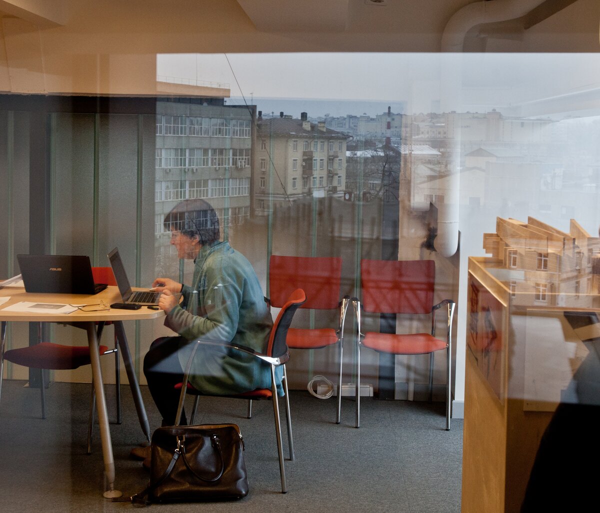 Еще один известный институт на фабрике – это "Стрелка" на "Красном Октябре". Продюсер образовательной программы Мила Илюшина говорит, что здесь по два помещения для студентов и сотрудников и одно общее. "Высокие потолки, ощущение большого пространства – это плюсы. Техническая проблема – под полом пустое пространство, которое норовят освоить грызуны", – говорит Мила.