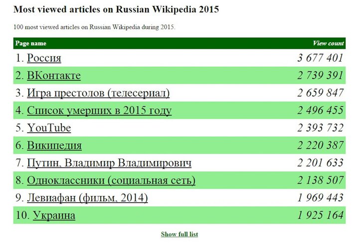 – Да. Например, в топ тем англоязычной и русской "Википедии" в прошлом году вошли список знаменитостей, умерших в 2015 году, сериал "Игра престолов" и Исламское государство (террористическая организация, запрещенная в России). По всему миру это Facebook, ИГИЛ, список фильмов Болливуда и США. В русскоязычной – это еще и "ВКонтакте", Россия и Путин.