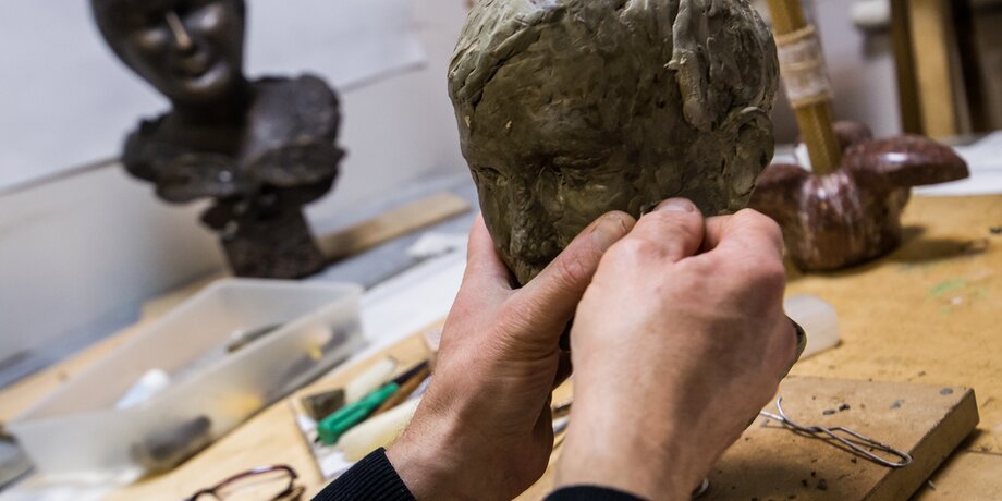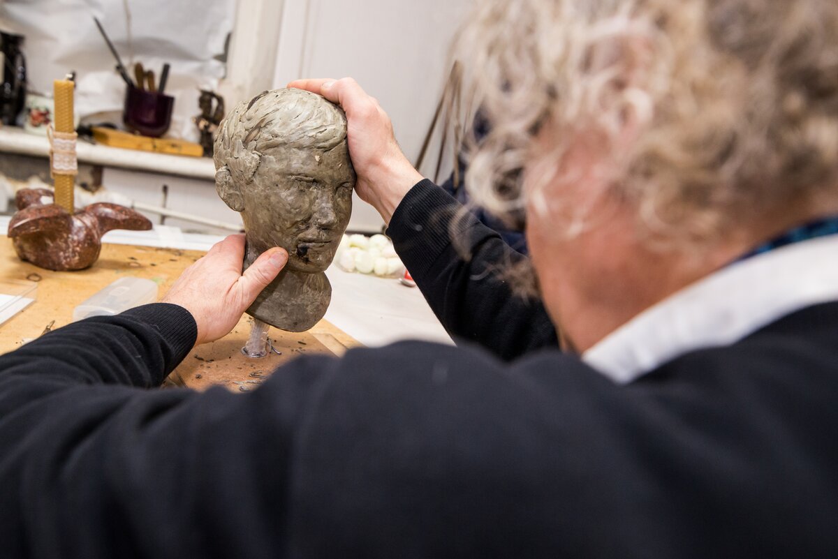Собеседник показывает свой любимый материал – пластилин: он мягкий и позволяет легко исправлять ошибки. На рабочем столе как раз стоит незаконченный пластилиновый бюст – изображение внука. Когда он ее закончит – работу отольют в бронзе.