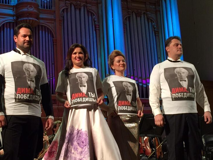 В завершении вечера солисты надели футболки с портретом Дмитрия Хворостовского и надписью "Дима, ты победишь!", таким образом выразив поддержку самому прославленному баритону России, который в настоящее время проходит курс лечения. О болезни Хворостовского стало известно 25 июня.