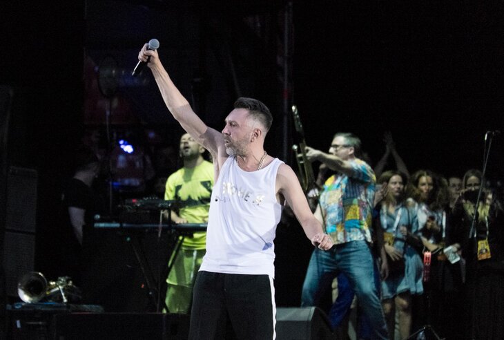 На концерте Сергей Шнуров был одет минималистично: в домашние шорты с лампасами и белую майку.